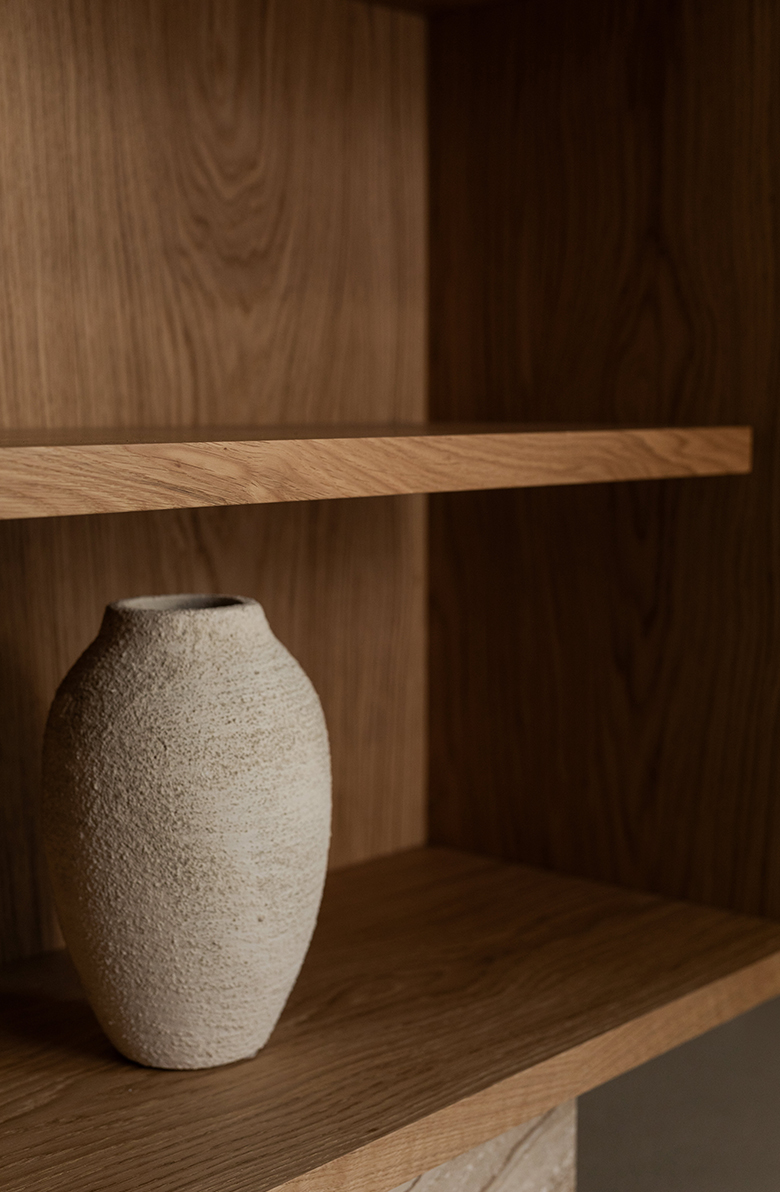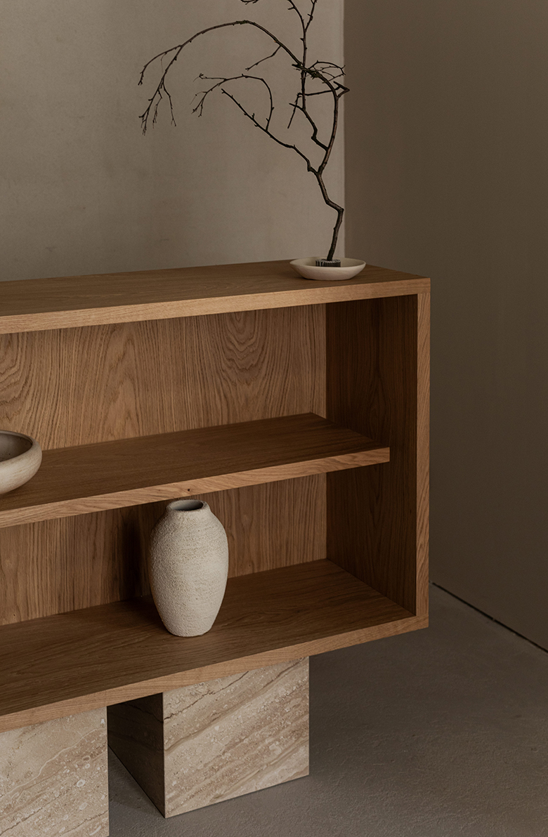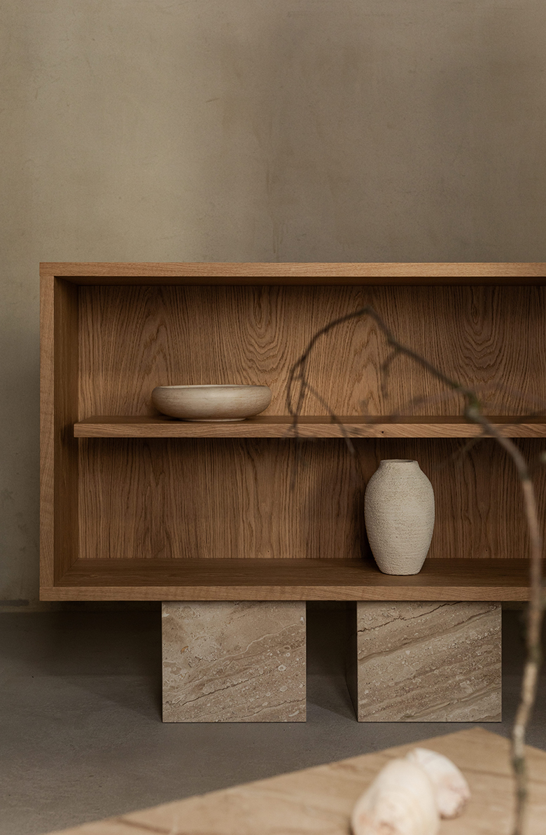 Seria BLOCK to poszukiwanie harmonii formy. Zakorzenione w filozofii równowagi, meble łączą surową, ponadczasową elegancję marmuru z ciepłą teksturą drewna. Rezultat? Meble codziennego użytku, które są jednocześnie monumentalne, minimalistyczne i pełne wdzięku. Drewniane półki odłączone od korpusu nadają regałowi lekkości i zaskakującego charakteru.