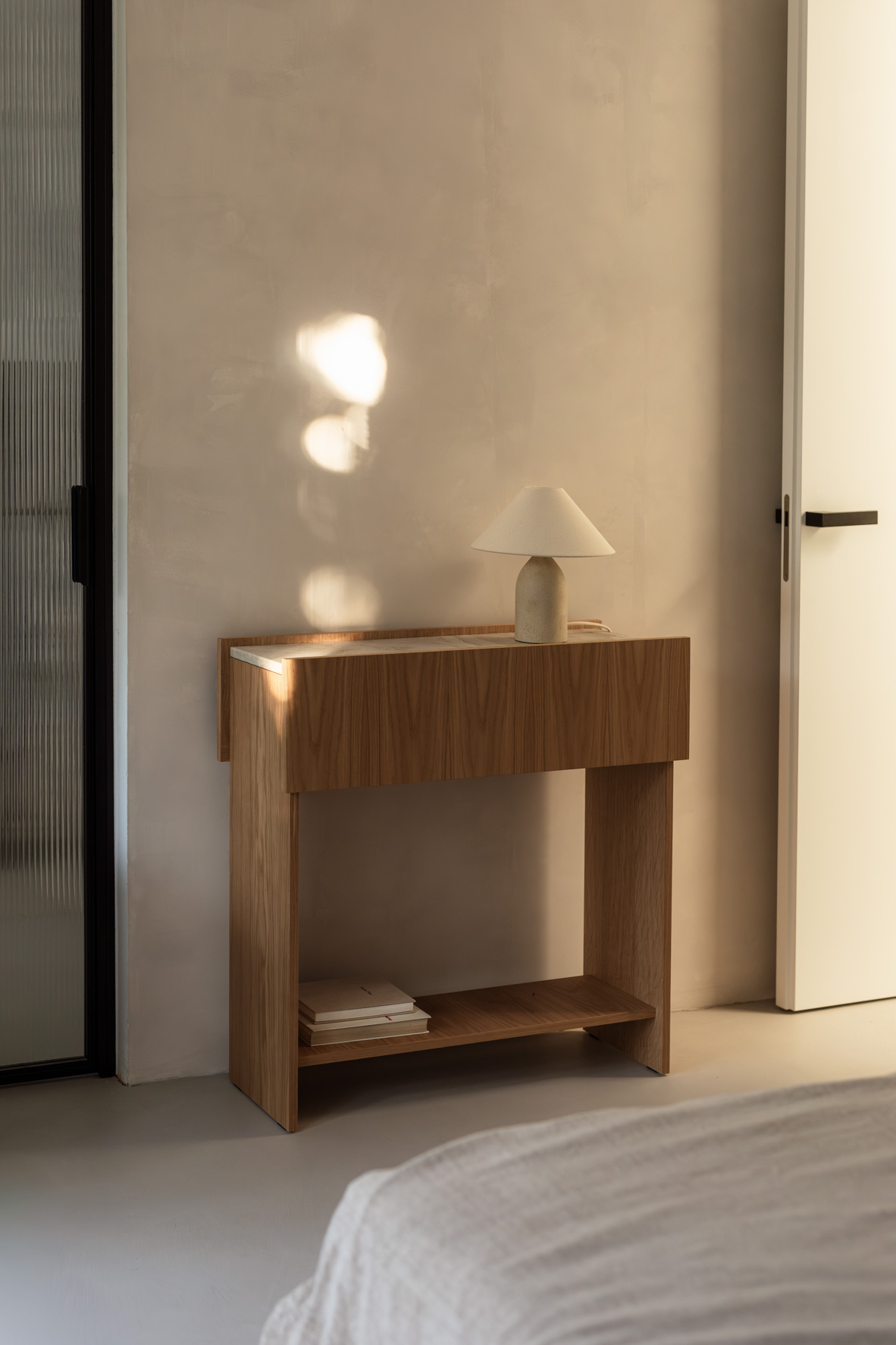 Konsola ORIA z serii LINEE to mebel o prostej formie z charakterystycznym cokołem wokół górnej części korpusu. Wyposażona w niewidoczną, na pierwszy rzut oka, funkcjonalną szufladę otwieraną systemem TIP ON. Dodatkowym ciekawym elementem jest dolna półka pozwalająca wyeksponować, wazon, albumy bądź inne ulubione przedmioty. Sercem mebla jest piękny blat wykonany z naturalnego kamienia: wyjątkowego, prążkowanego trawertynu lub eleganckiego kwarcytu Taj Mahal o wspaniałym satynowym wykończeniu.