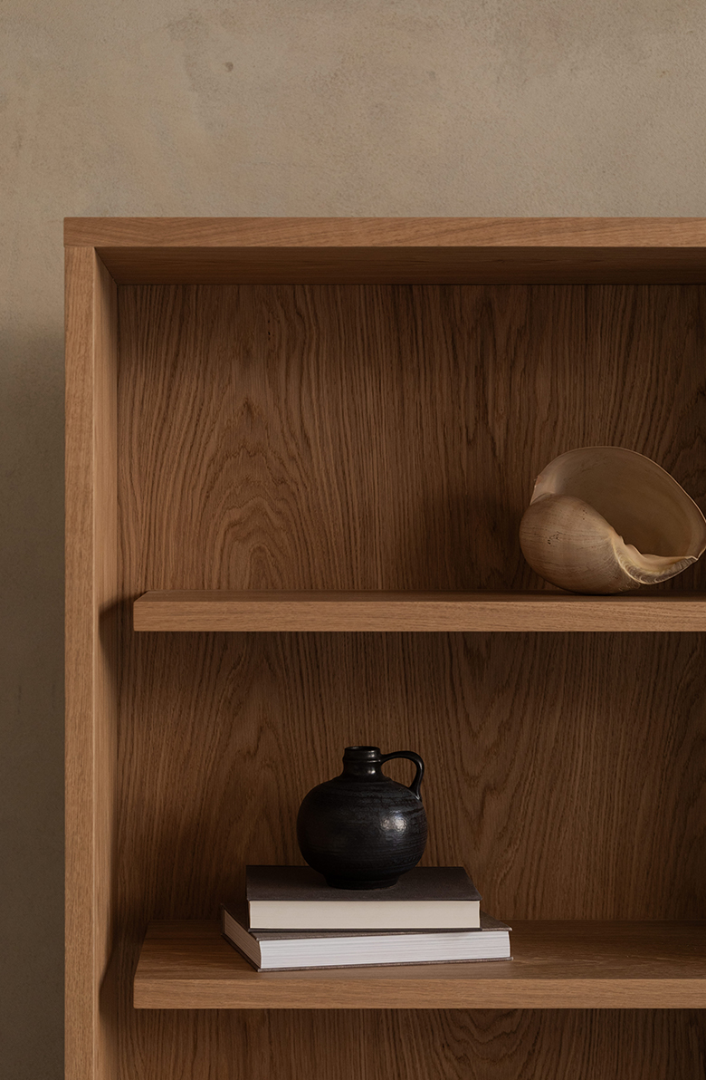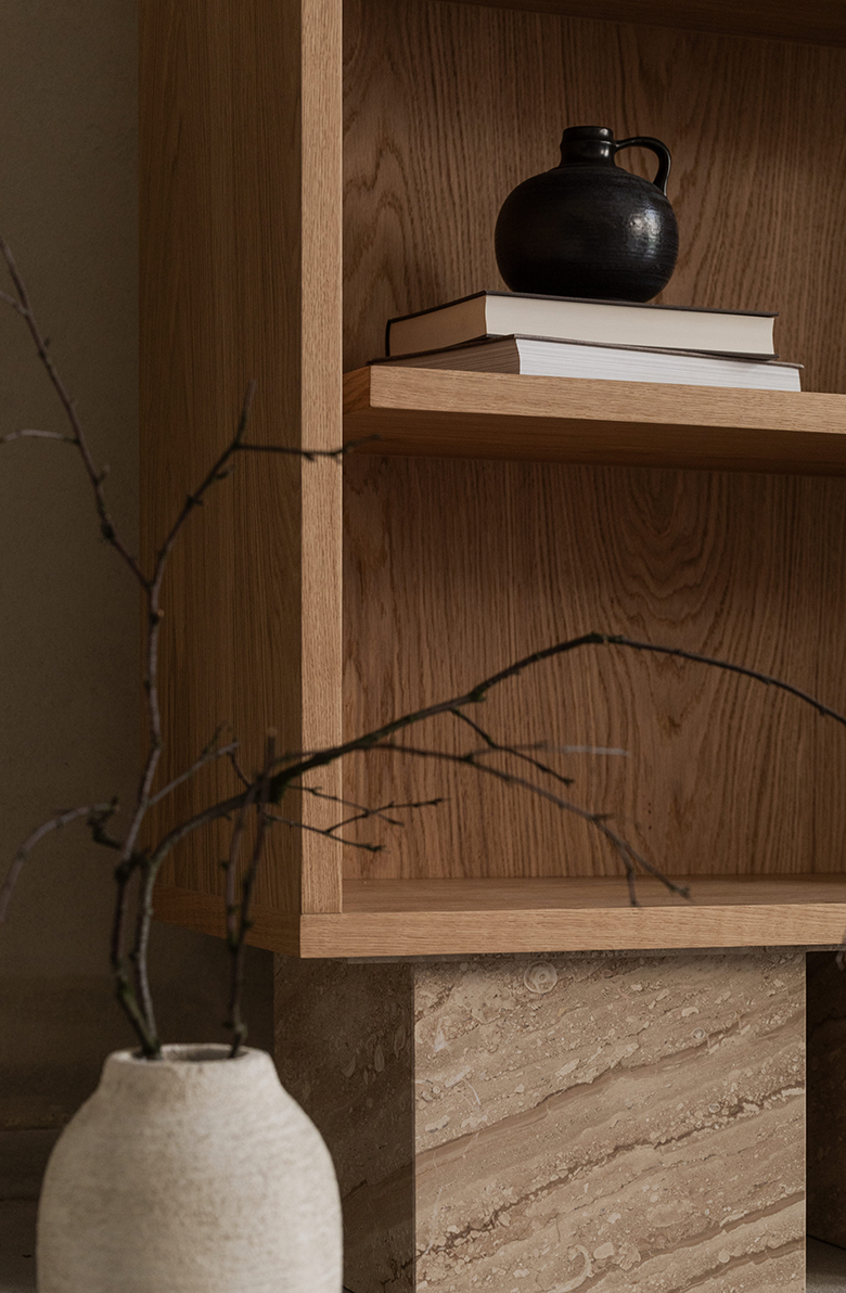 Seria BLOCK to poszukiwanie harmonii formy. Zakorzenione w filozofii równowagi, meble łączą surową, ponadczasową elegancję marmuru z ciepłą teksturą drewna. Rezultat? Meble codziennego użytku, które są jednocześnie monumentalne, minimalistyczne i pełne wdzięku. Drewniane półki odłączone od korpusu nadają regałowi lekkości i zaskakującego charakteru.