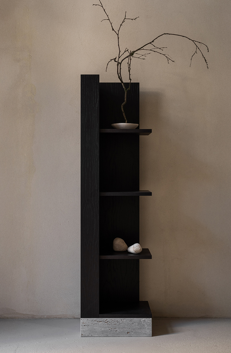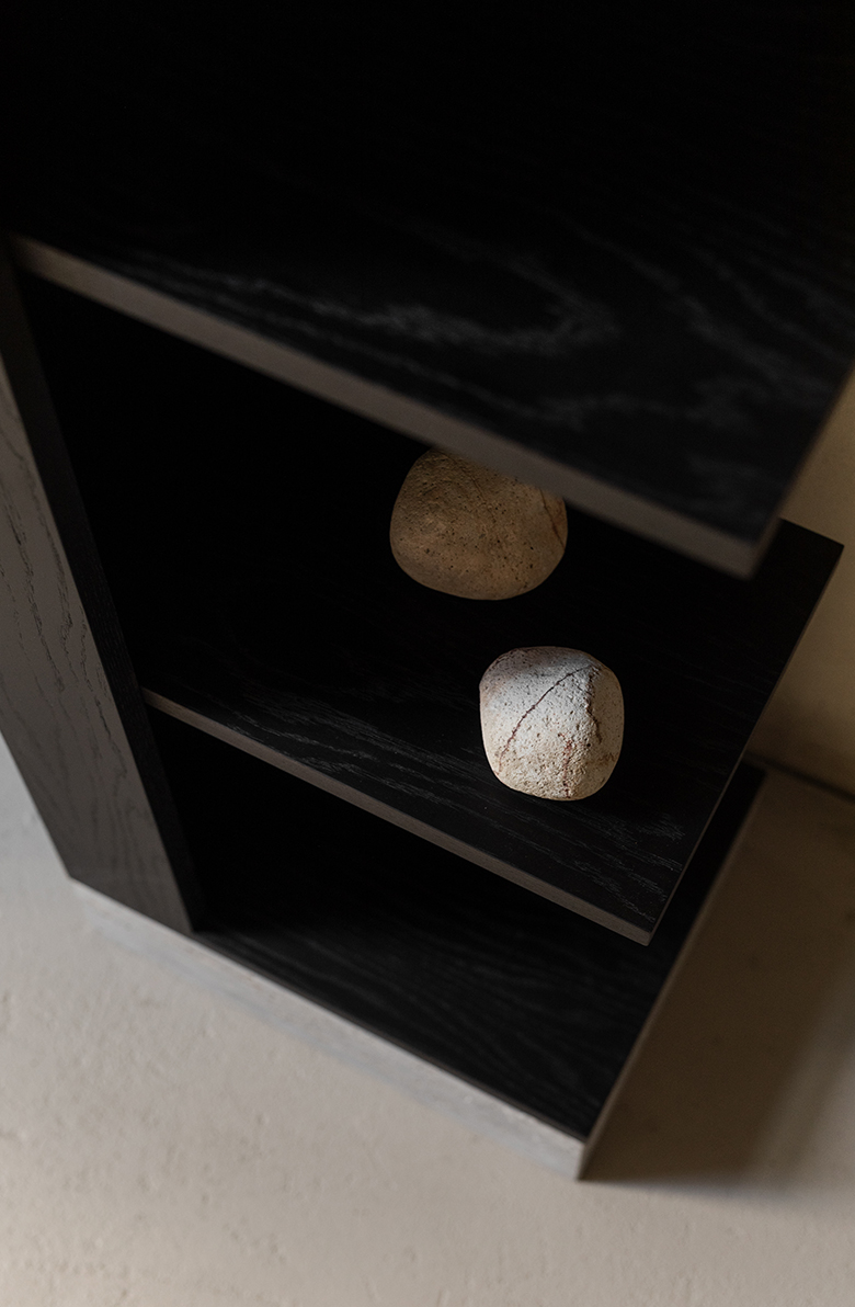 Regał CONE 140 cm / grafitowy dąb ora baza wykonana z szarego trawertynu Silver
