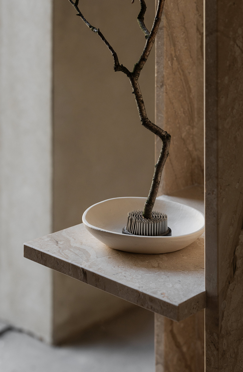 Mebel CONE Marble wykonany jest całkowicie ze szczotkowanego marmuru Breccia lub Fior di Bosco.