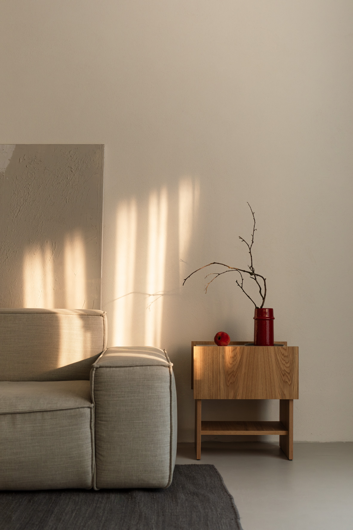 Korpus mebla wykonany z naturalnego forniru dębowego w kolorze ciemnego grafitu. Zestawienie delikatnego beżu oraz ciemnego wykończenia drewna podkreśla geometryczną formę mebla.